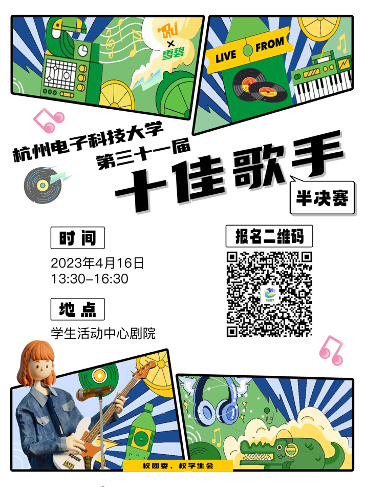 活动介绍:经各学院选拔报送,共有32名选手晋级本届校园十佳歌手大赛半决赛。半决赛将角逐出前15名选手晋级第三十一届校园十佳歌手大赛决赛。欢迎广大师生扫描“青春杭电”第二课堂管理系统报名二维码前来观看。